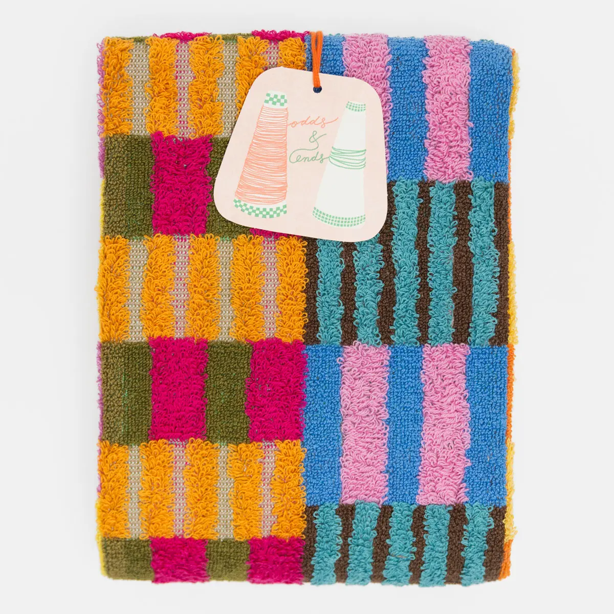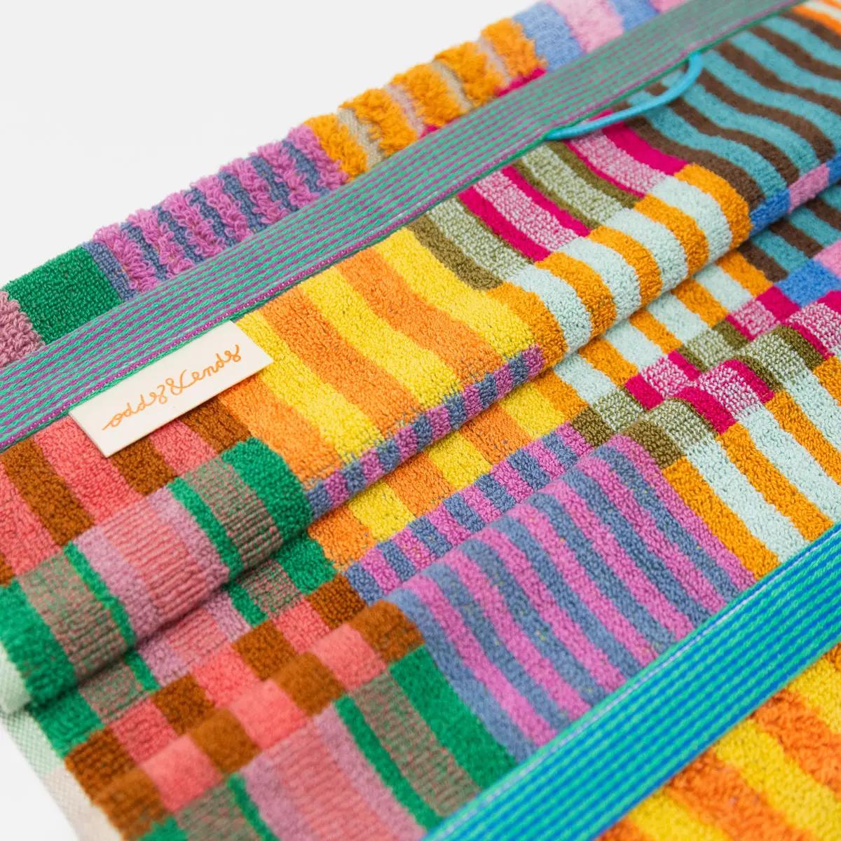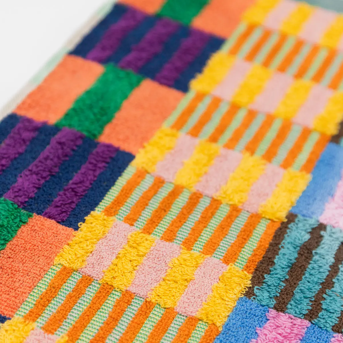 Bath mat from the Foekje Fleur Odds & End collection. These colorful home textiles are made of industry leftovers! When factories dye yarns to weave textiles, they make some extra—just in case—but they often go unused. The Odds & Ends textiles are designed to get the most out of these remainders, creating unexpected color combinations.