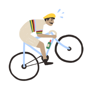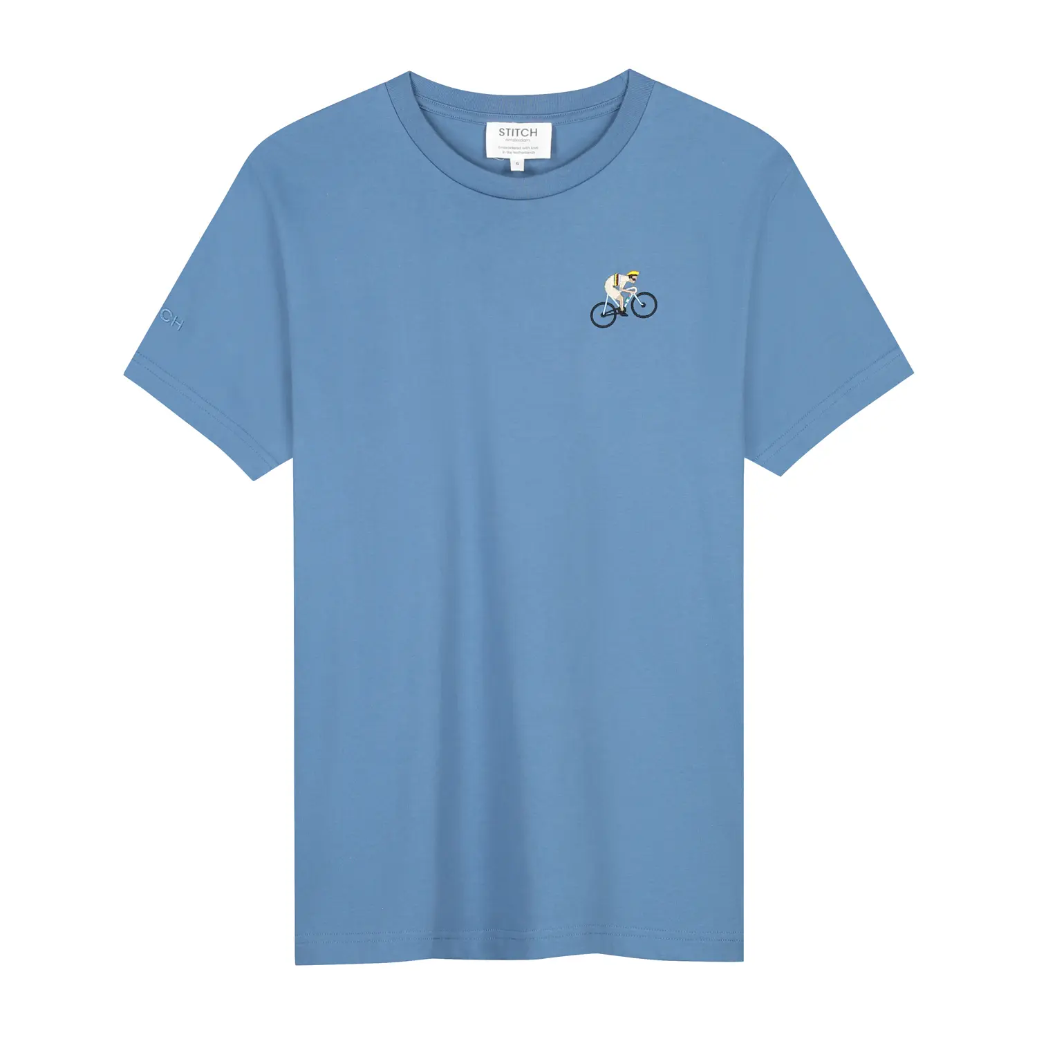 Unique cycling design stitched on heavy weight t-shirts in denim blue color.