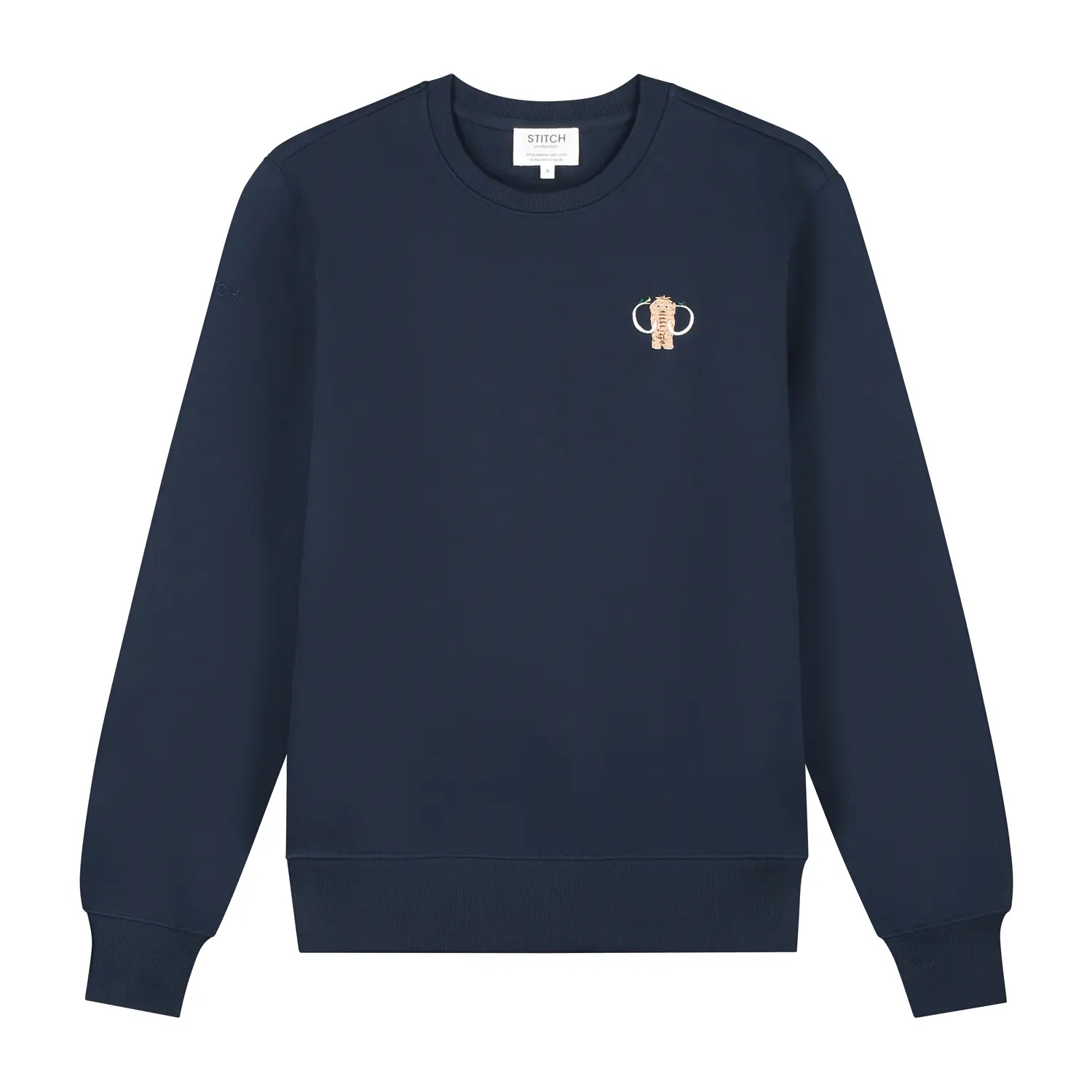 Our new Mammoth sweater, stitched on our navy sweater. Soft, funky, and made with love.